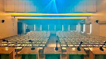 Salón preparado para sus celebraciones con una capacidad de 250 personas. Está equipado con todos los elementos audiovisuales modernos necesarios, aire acondicionado, audiovisión, videoconferencia, proyección e iluminación así como el mobiliario requerido para toda clase de reuniones.